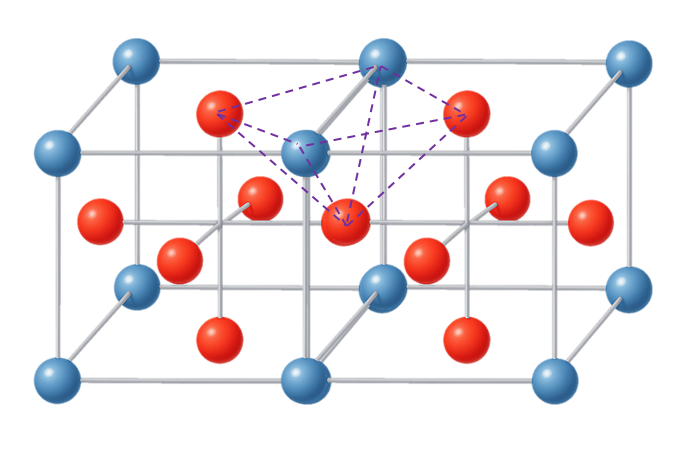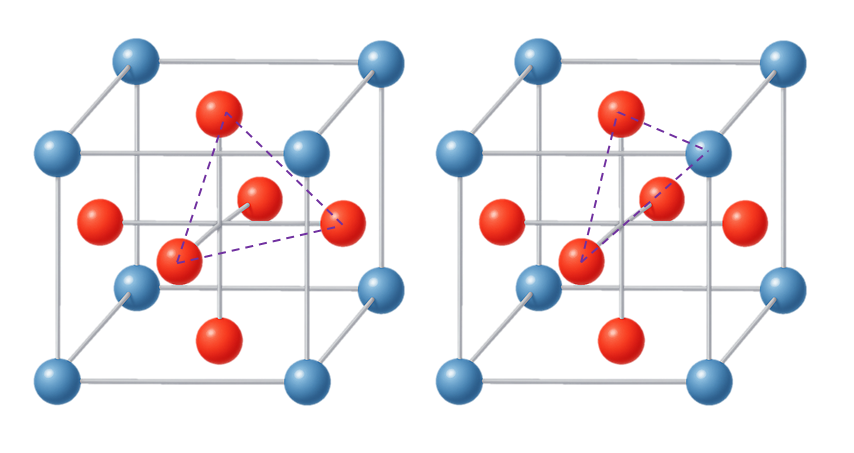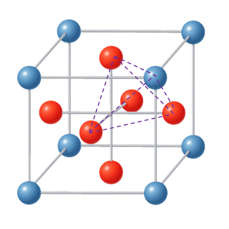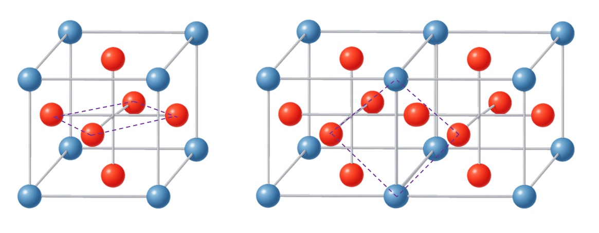 두번째 패턴은 두개의 큐브를 결합하는 경우 그 사이에 사각형을 형성하고 그 사각형에 수직으로 최근접하는 면중심 공과 연결하는 피라미드 패턴이 가능하다. 이 패턴은 면 하나당 4개가 발생하고 총 6면이므로 24개가 생기지만 1/2 지분을 갖기 때문에 총 12개가 발생한다.